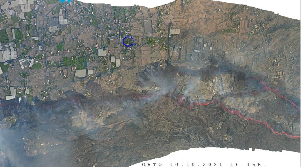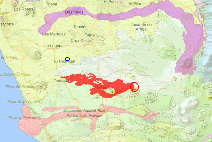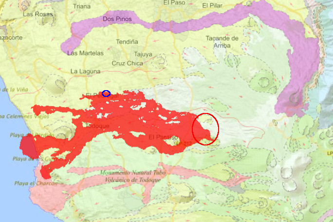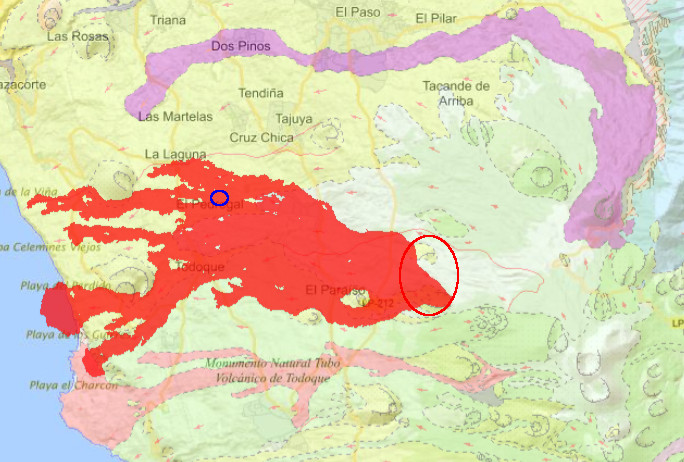 In den drei Karten sieht man die aktuelle Lava in verschiedenen Strömen (rot), die Lavaströme der vergangegen Ausbrüche (lila, rosa) den Vulkan als roten Kreis und das Haus in Cumplido als blauen Kreis.