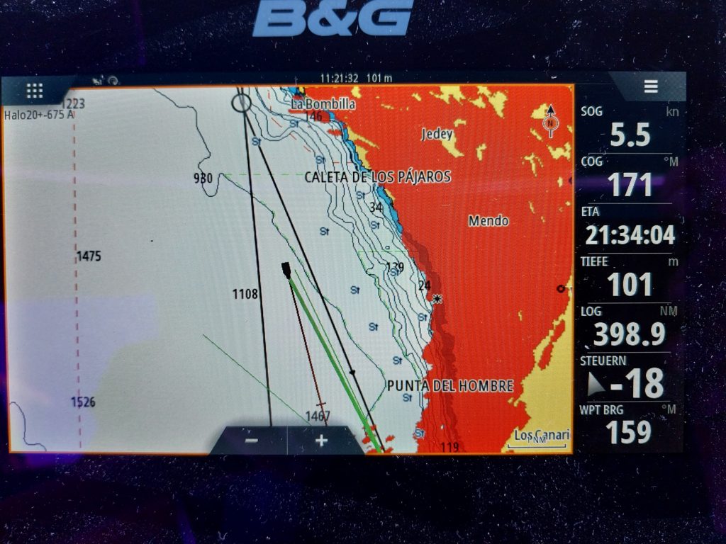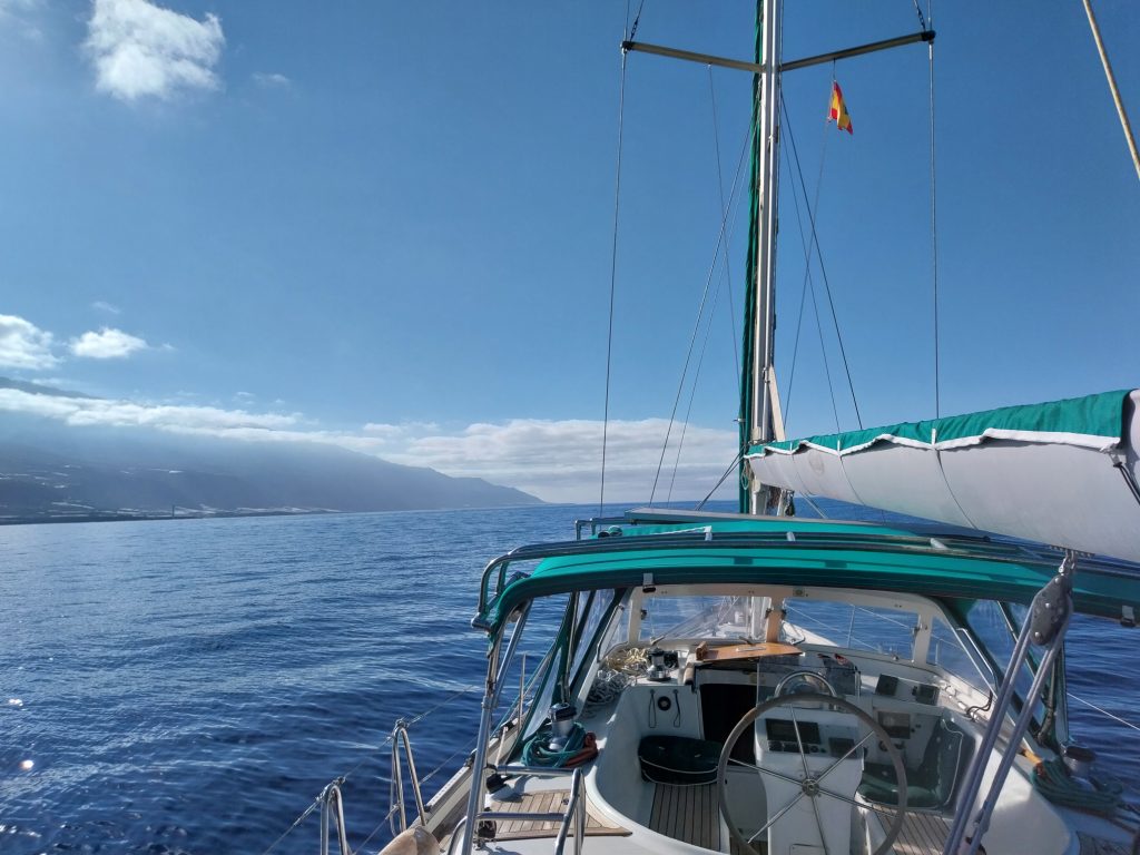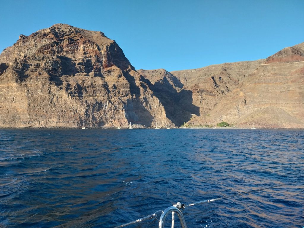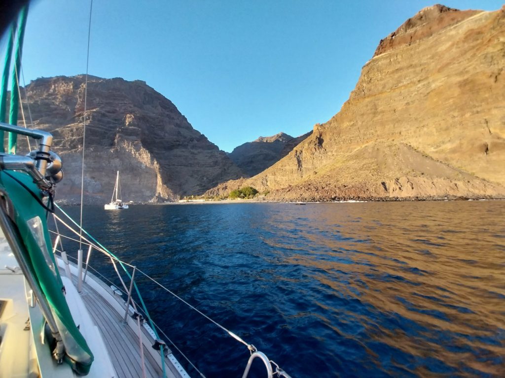 Das Segeln läuft bestens und wegen der Windzu – und Abnahmen durch die Beschleunigungszone können alle Aus- und Einreffmanöver eingesetzt werden. Die Reffeinrichtungen funktionieren alle wie gewünscht. Ab der Hälte der 8 Stunden Überfahrt nach La Gomera, muss dann motort werden. Um zum Sunset vor Anker zu sein, müssen 6kt über Grund her. Aber der Kanarenstrom hilft dabei und pünktlich bekommt die Steilküste von La Gomera Struktur.