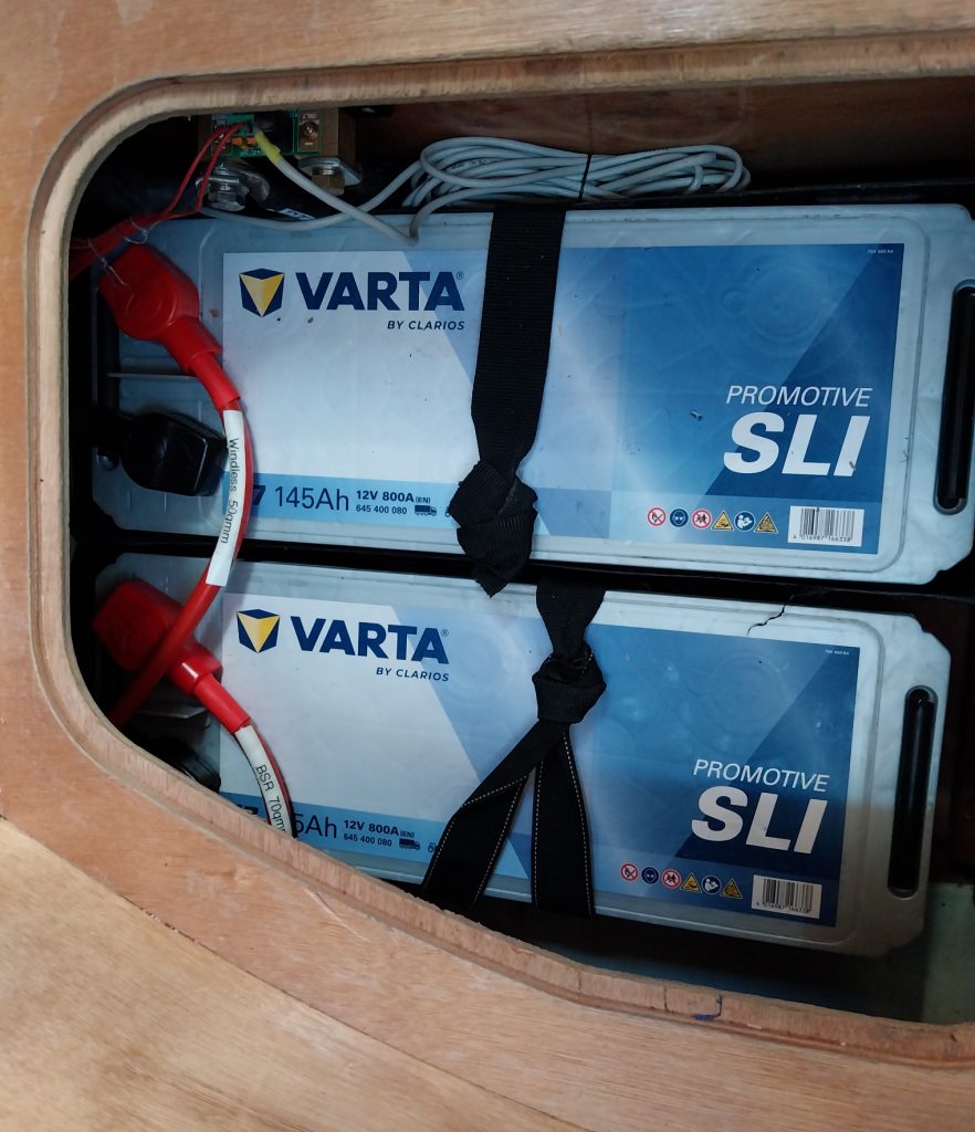 Der Plan ist nun also so: Die vier alten Bleiakkus werden durch zwei gleiche Bleibatterien und zwei Lithium Batterien ähnlicher Größe ersetzt. Die Bleibatterien sind wartungsfreie LKW Varianten mit 145Ah jede. Das waren vorher also 580Ah für alle Verbraucher zusammen. Jetzt werden nur für die Bordelektrik (Navigation, Licht, Inverter, etc.) zwei LiFePo4 mit je 200Ah parallel geschaltet, macht 400Ah nur dafür. Eine der Bleibatterien versorgt die Anker- und Fallenwinsch (145Ah) und die zweite ist nur für das Bugstrahlruder da (145Ah).