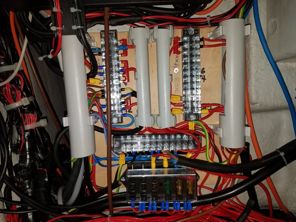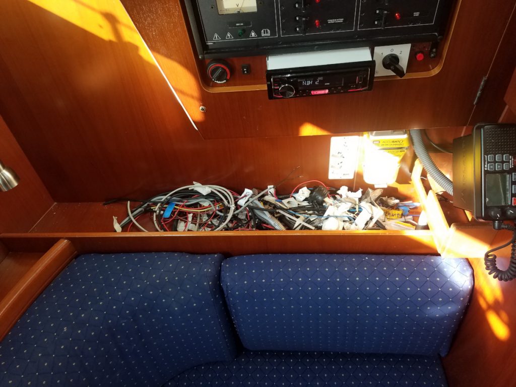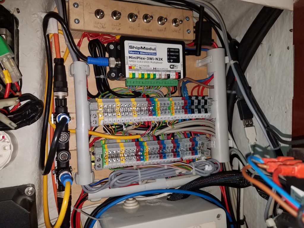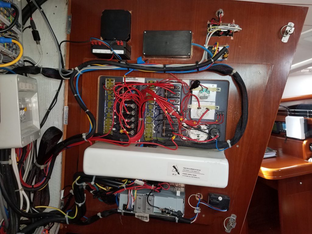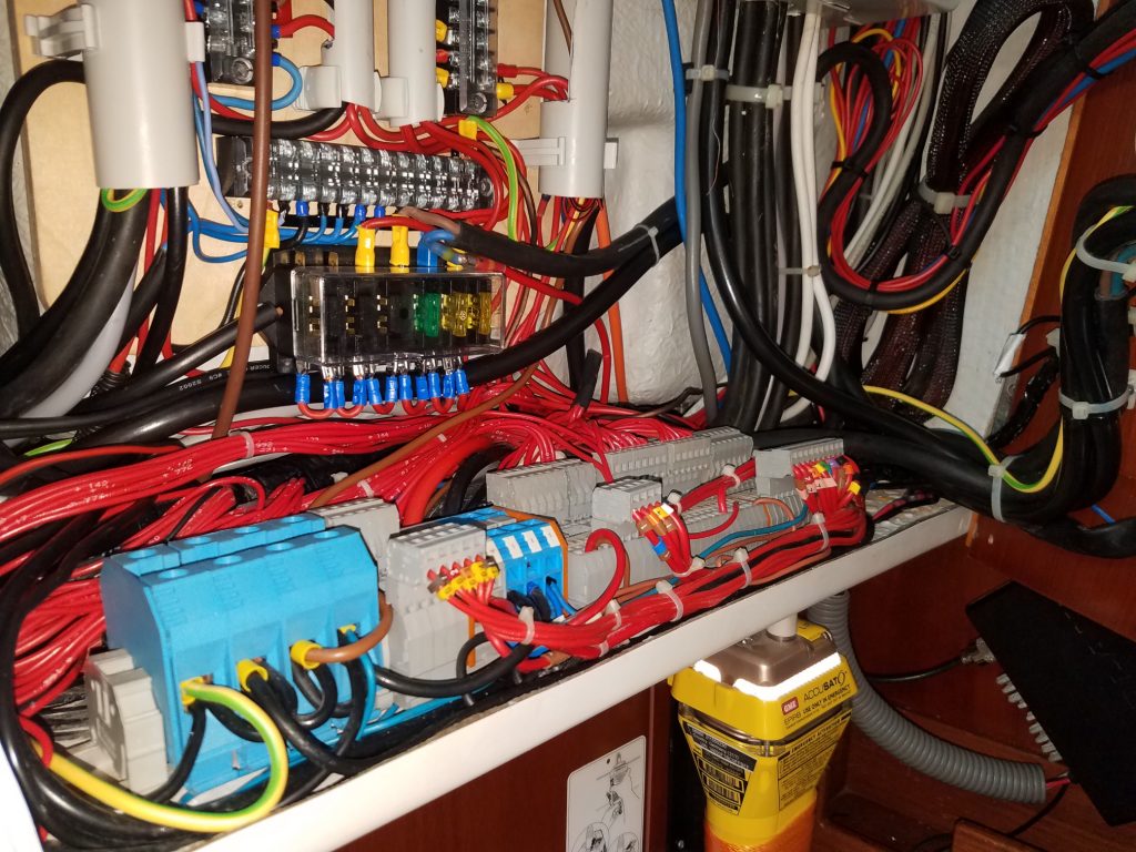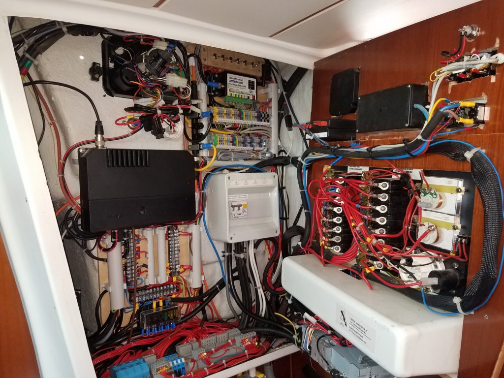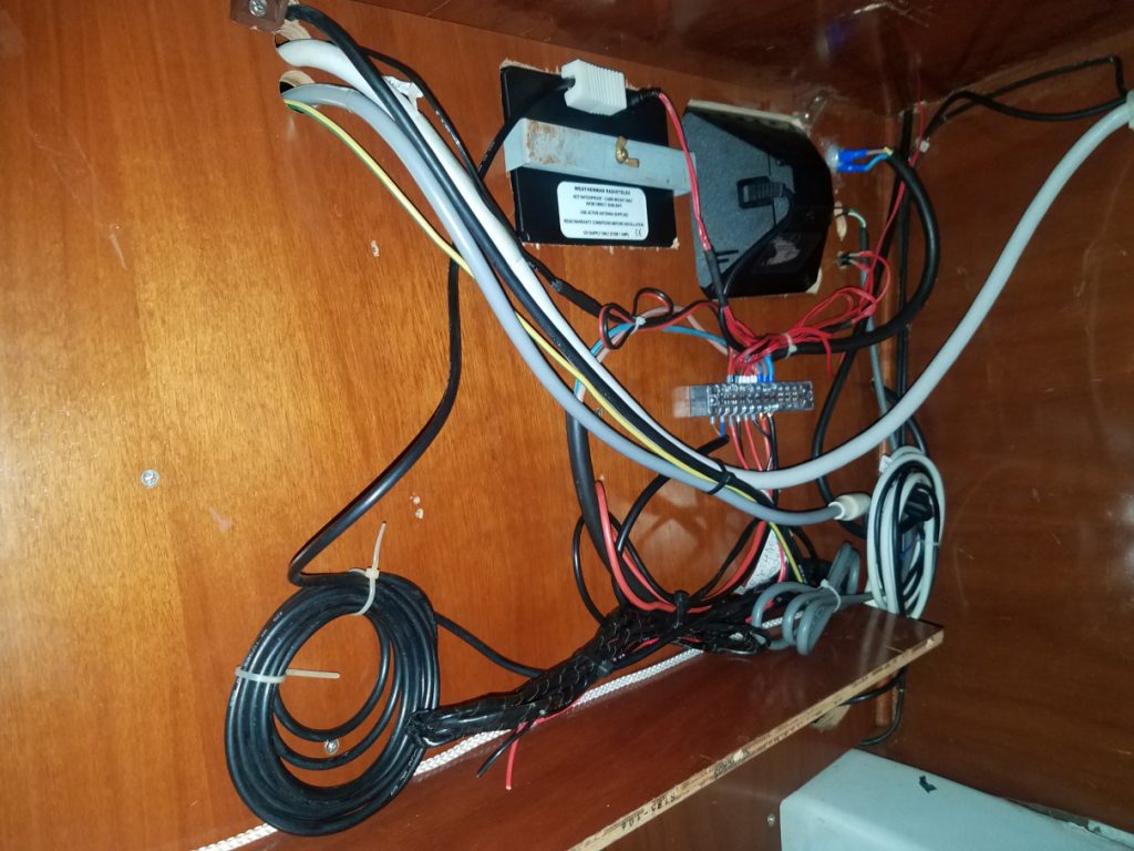 Man sieht wie immer eigentlich kaum was, außer das es ordentlicher wurde. Die Installation wurde auf die Grundelektrik aus Frankreich zurück gebaut und dann zuverlässig erneuert. Vor allem die zusätzlichen Verbraucher bekommen ihren Strom jetzt von der neuen Unterverteilung unter dem schwarzen Funkgerät und die drei Datenbusse sind mit einem zentralen Multiplexer (Shipmodul) oben rechts verbunden. Die serielle Leitung zum PC wurde duch Netzwerk oder WLAN ersetzt und oben links ist noch Platz für eine Fritzbox. In der Mitte verzweigt das NMEA 2000 Backbone vom Multiplexer zum Bug und zum Heck.