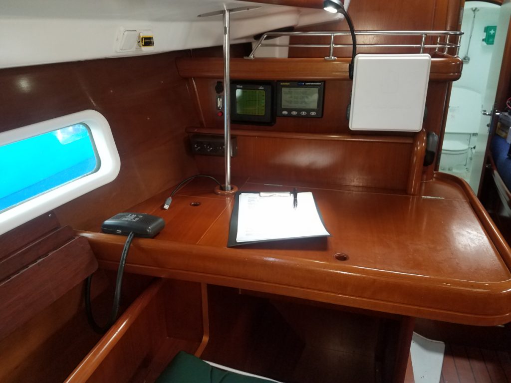 Der Strom kommt von einem Inverter für 600W, der je eine Steckdose pro Kajüte versorgt, oder von einem Backupinverter, der nur für den Navtisch da wäre.