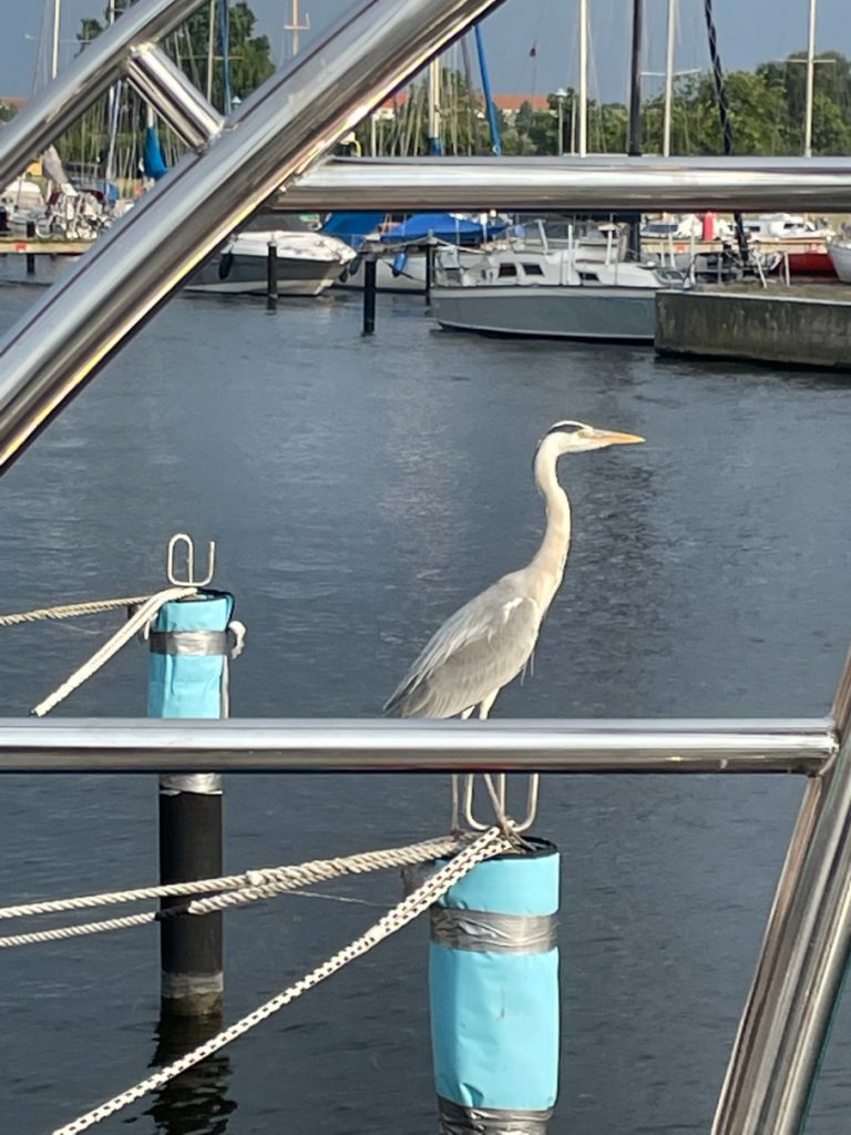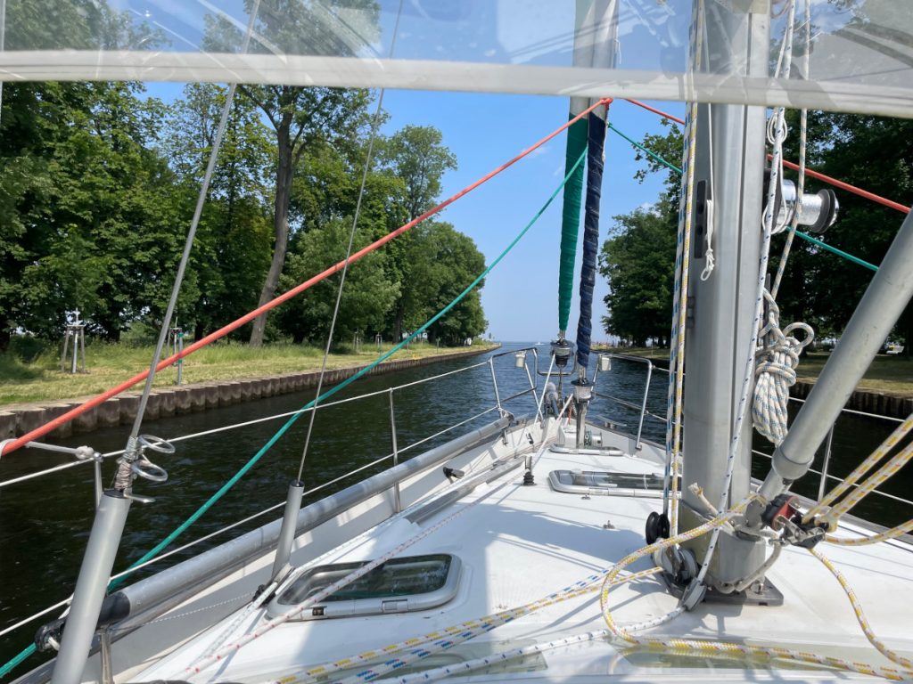 Das Haff ist flach. Der Tiefenmesser zeigt seit einer Meile 3m. für das erste Mal „Anker Go“. Die Kette ist Niro, ohne Flicken, mit Längenmarkierungen und der Daltaanker hält sofort. Die Ankerwinsch geht ja nun auch wieder.