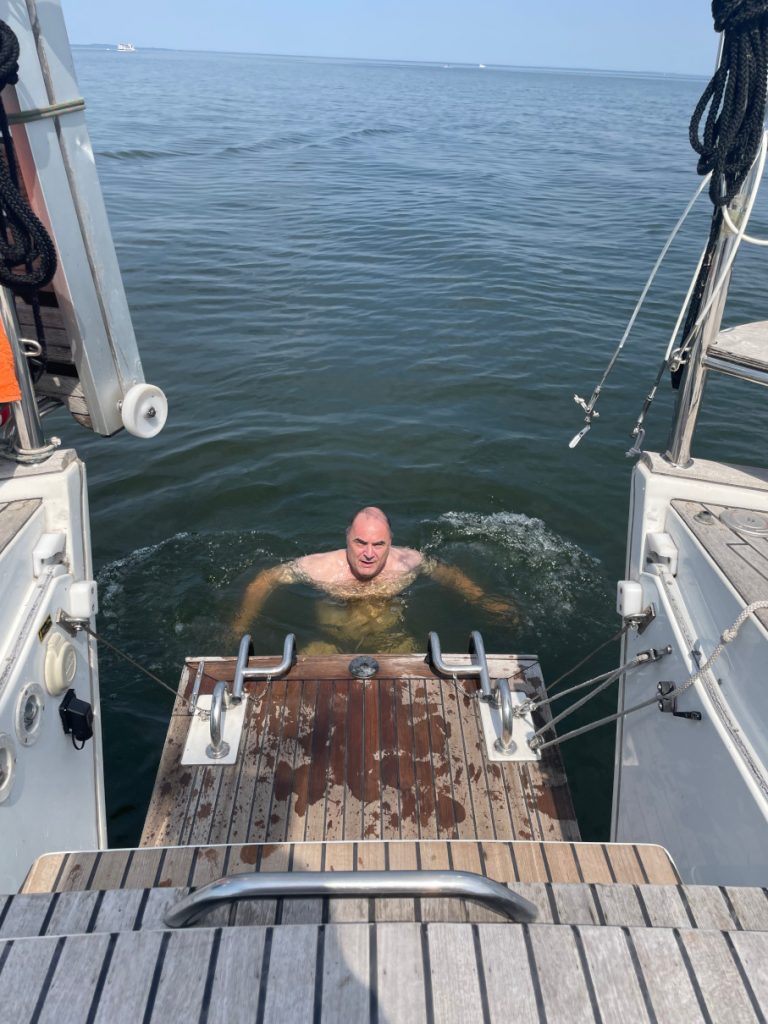 Mit der Badeplattform kühlen wir ab und schauen noch mal auf das Wetter. Da mittlerweile Gewitter möglich sind, fahren wir zurück. Im Moterraum sind es gefühlte 60°C. Die Elektronik hält aber trotzdem tapfer durch. Systemtest „Motorraum in der Karibik“ bestanden!